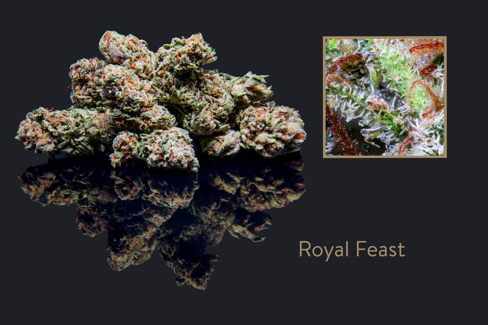 Royal Feast entstand aus der Kreuzung eines Royal Sour Kush-Weibchens mit einer männlichen Garlicot. Die Blüten kommen oft mir einer leichten purple-Färbung daher und verströmen einen Geruch nach weihnachtlichen Gewürzen und getrockneten Früchten.